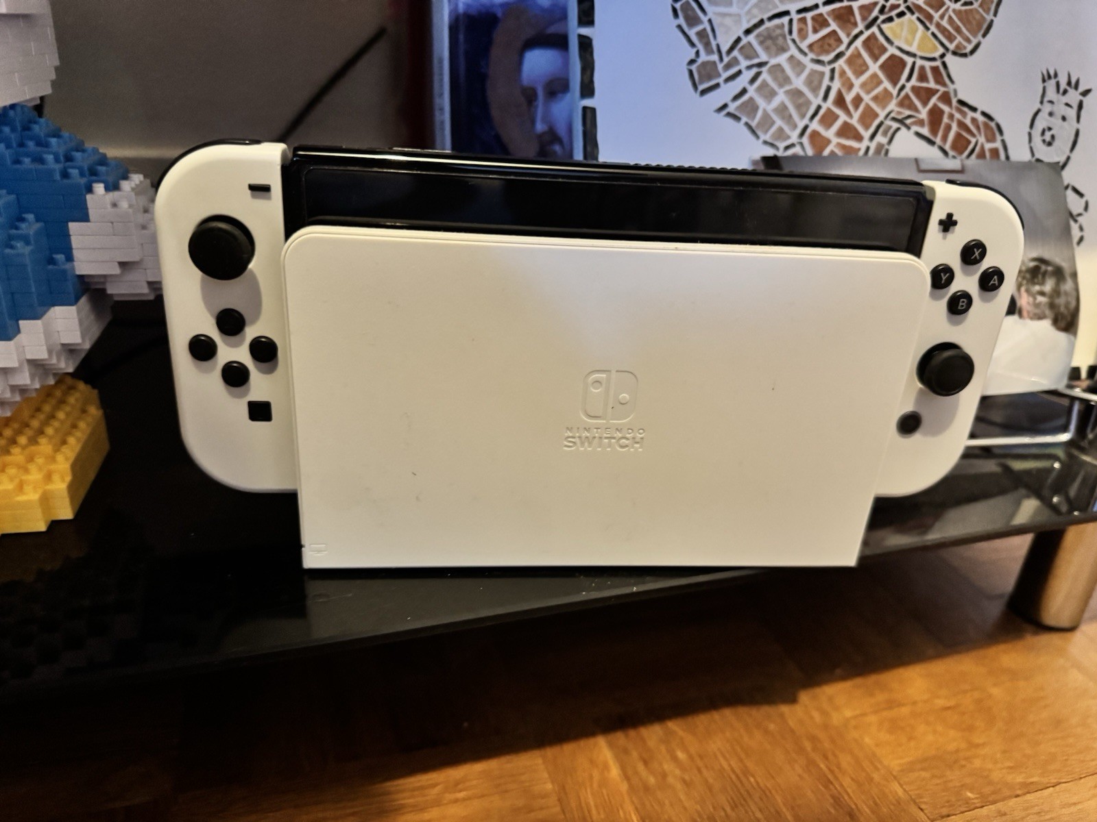 Nintendo Switch (modèle OLED) avec station d’accueil et manettes Joy-Con blanches, qui inclut des manettes Joy-Con blanches, une unité principale noire et une station d’accueil blanche.